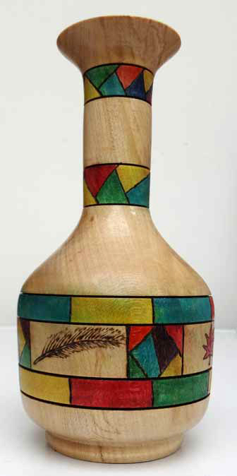 Anyway, I turned the vase from a spindle of 3inch square sycamore and sanded it down to 400 grit. Then I cut some rings around it with the tip of a skew chisel and used a wire to burn lines into the grooves that I made. Once I knew exactly what the shape would be I did some sketches on paper to work out a pattern. These were then burnt into the wood with my pyrography iron. It is important when burning the lines to go deep enough to create a seal between areas of different colour. I used chestnut stains for the colour and these can seep quite deeply into the wood. If you don't burn deep enough you will soon find that the edges between two colours will mix, blue and yellow for instance, will soon turn green and that doesn't look very nice.